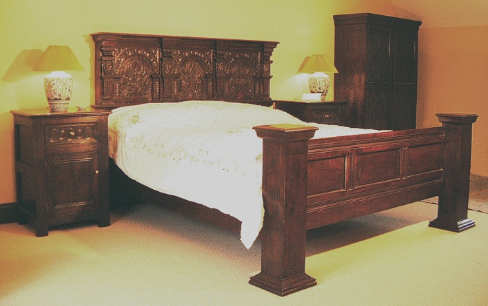 A hand carved oak 'merchants bed', made to fit a king size mattress, in kiln dried English oak. Like most beds of this type, it dismantles into manageable components for transportation. The two carved bedside cabinets were also made by us. All our carving is carried out by craftsmen and craftswomen based in England. a This hand carved bed and carved bedside cupboards are now featured on our sister site Early Oak Reproductions with size, colour, finish and price options. |