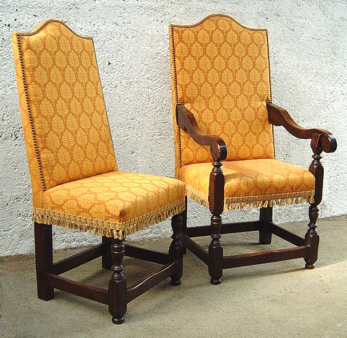 Two examples from a set of six upholstered chairs and two armchairs. The leg turnings are scaled down versions of the clients table legs (also made by us) and the period style arms of the chairs have been designed to fit neatly under each end of the table top. These oak upholstered chairs are now featured on our sister site, Early Oak Reproductions, with size, colour, finish and price options. |