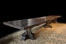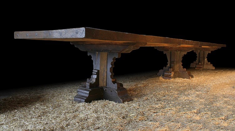 A Late 15th Century Style Oak Trestle Dining Table, handmade (click this link to appreciate what goes into our handmade furniture) from old reclaimed oak. Based on a pair of tables in the Great Hall at Penshurst Place, Kent, this example is almost 20ft long with a 3 inch thick top and will seat 18 people comfortably. Made for our clients castle in Ireland and the result of hundreds of hours work, both in making and finishing. 34 components all cut with hand held tools, hand planed and individually fitted using pegged joints. 236" long x 44" wide (600 cms x 112cms) a Price Guide: top end of I (handmade from old reclaimed oak) More photos below, including some 'in the making' |