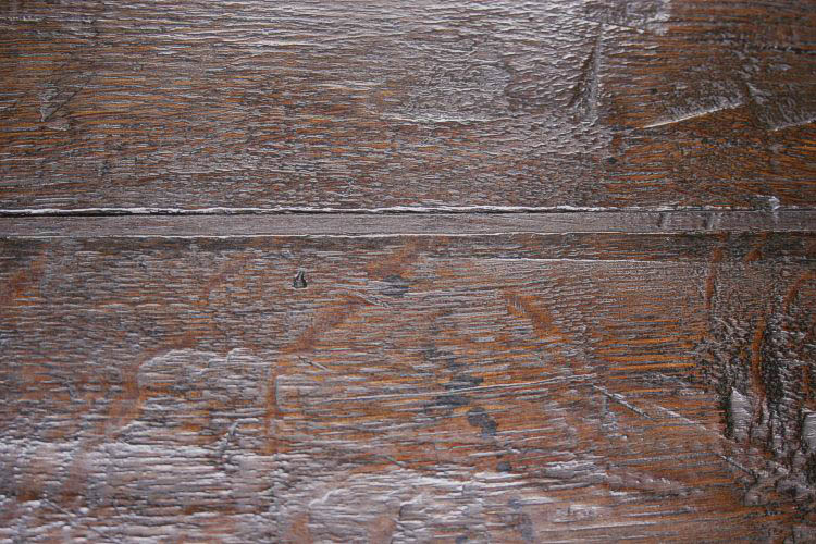 Detail photo of the hand prepared and finished table top surface, where you can see the thin slithers of oak that have been inserted between the boards to take up the 'shrinkage' 'over several centuries'!! |