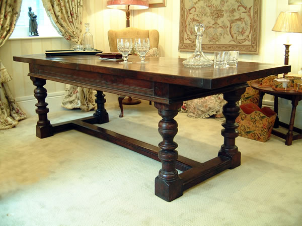 8 foot long table with boldly turned baluster and peg legs, joined by